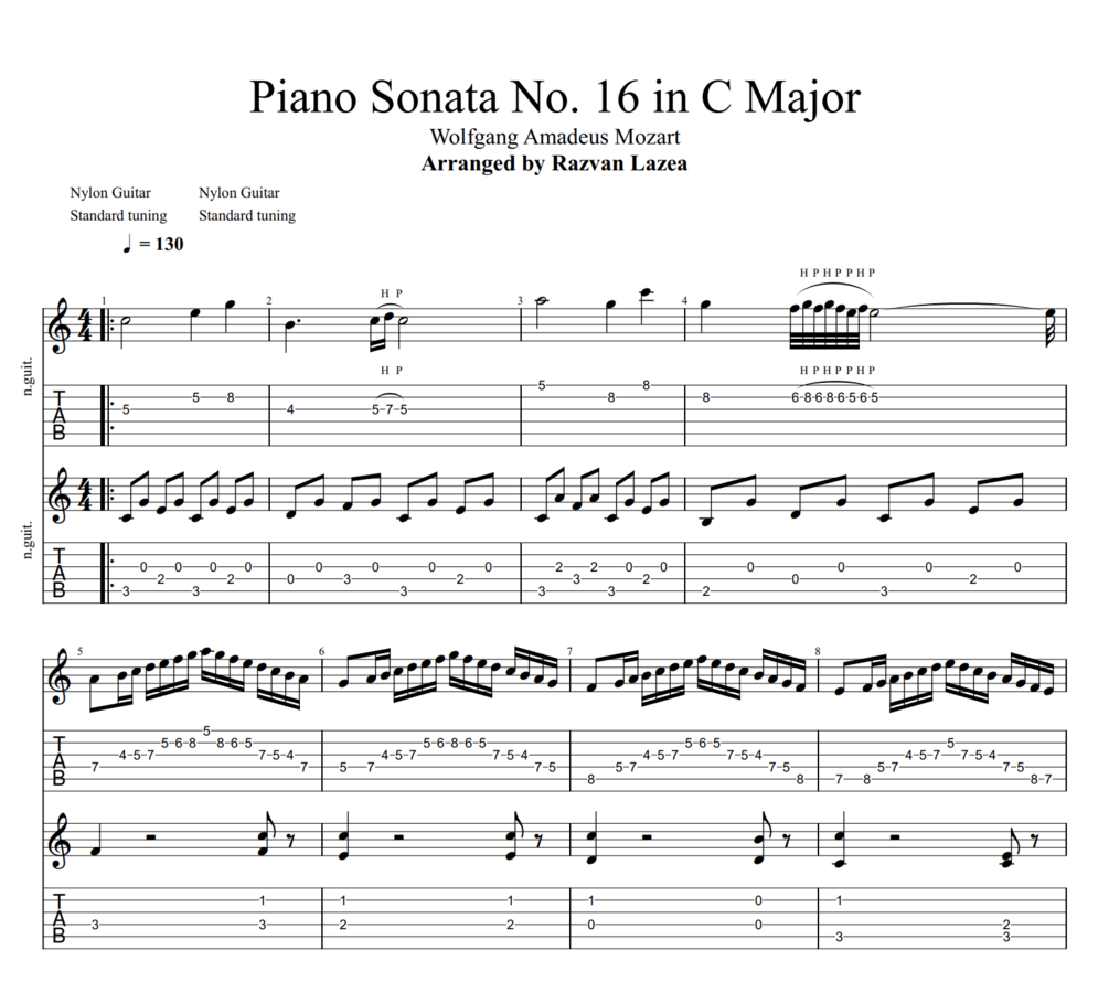The full guitar TABS for Piano Sonata no 16 in C Major by Mozart in 2 formats: PDF and GuitarPro.